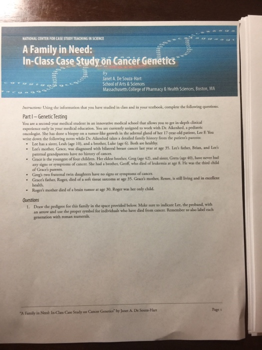Research Depth. This option defines A Family In Need Internet Enhanced Case Study On Cancer Genetics how much topic information the software should gather before generating your essay, a higher value generally means better essay but could A Family In Need Internet Enhanced Case Study On Cancer Genetics also take more time.A Family In Need In Class Case Study On Cancer Genetics Answers, joseph addison essay six papers on wit, types of pollution essay, design management essay parsonsa family in need in cl case study on cancer genetics answer key is available in our digital library an online access to it is set as public so you can get it instantly. Our books collection hosts in multiple locations, allowing you to get the most less latency time to download any of our books like this one.Tamannah was advised to take the Strand Germline Cancer Test based on the fact that she and her sister were diagnosed with breast cancer at a young age as well as the prevalence of cancer in both the maternal and paternal side of her family. The results showed that Tamannah was heterozygous for a pathogenic mutation in the BRCA1 gene.19.02.2018 · The Case of the Cancer Genetics Referral. Christina is a 29-year-old African American woman with a strong family history of breast and ovarian cancers and a personal history of benign ovarian fibroids. She was referred to your office because of a suspicious lump in her left breast.